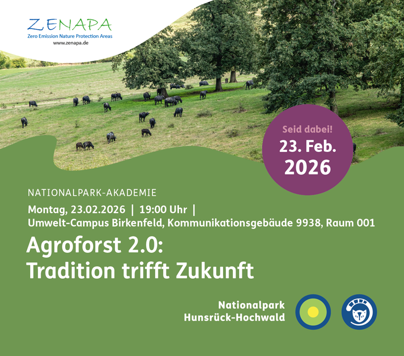 Die Veranstaltung findet am 23.02. am Umwelt-Campus-Birkenfeld im Rahmen vom EU-LIFE-Projekt ZENAPA (Zero Emission Nature Protection Areas). Der Vortrag ist Teil der Nationalpark-Akademie vom Nationalpark Hunsrück-Hochwald. Der Eintritt ist kostenlos, eine Anmeldung ist nicht nötig. Kommen Sie einfach vorbei!