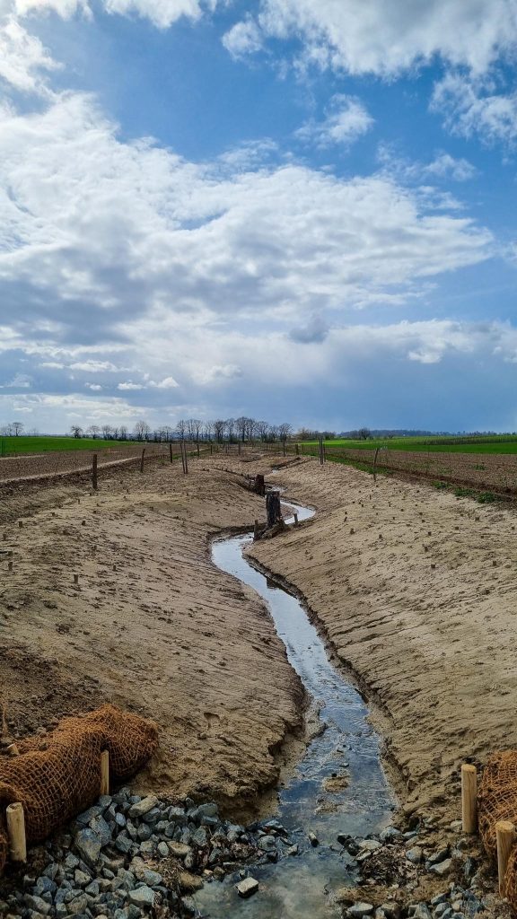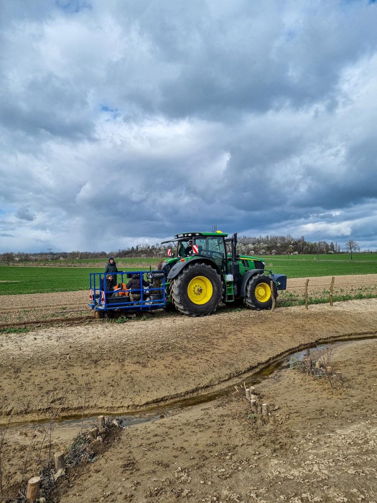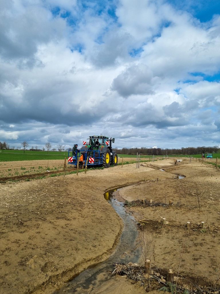 Im letzten Jahr wurde bereits das benachbarte ca. 70 ha große Agroforstsystem der Böhlitzer Agrar e.G. gepflanzt, welches hervorragend angewachsen ist. Nach der erfolgten Offenlegung und Renaturierung des Gewässers im Herbst/Winter 2025/26, wurden am 26.03.2026 nun die gewässerbegleitenden Agrarholzstreifen angelegt. Diese Kombination ist einmalig in Deutschland und soll nun Schule machen. Deshalb ist der Standort als Forschungs- und Demonstrationsstandort in AGROfloW (AFaktive Schwesterprojekt) ausgewiesen.