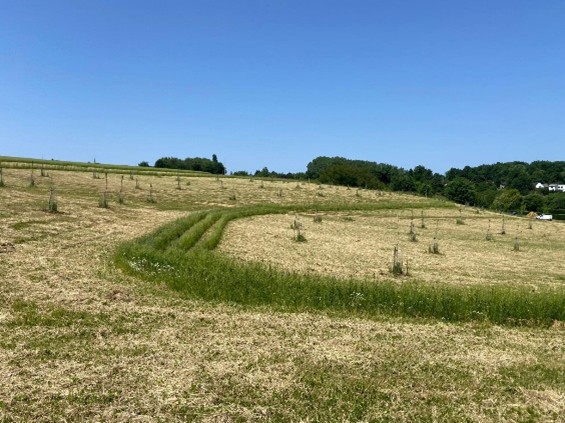 AWAF, the Walloon AFaktive partner, supported him with the design and implementation of his agroforestry systems and additional water management measures. After a thorough analysis of the context of the farm and objectives of the farmer, they decided on mixed agroforestry systems including a grazed orchard, a vegetable garden intercropped with an orchard, and biodiversity hedges. To reinforce water infiltration and retention, erosion control hedges and mini-swales were installed. From September 2024 to February 2025, the whole system was implemented: a meadow was sown, 3 hedges and more than 200 fruit trees were planted.